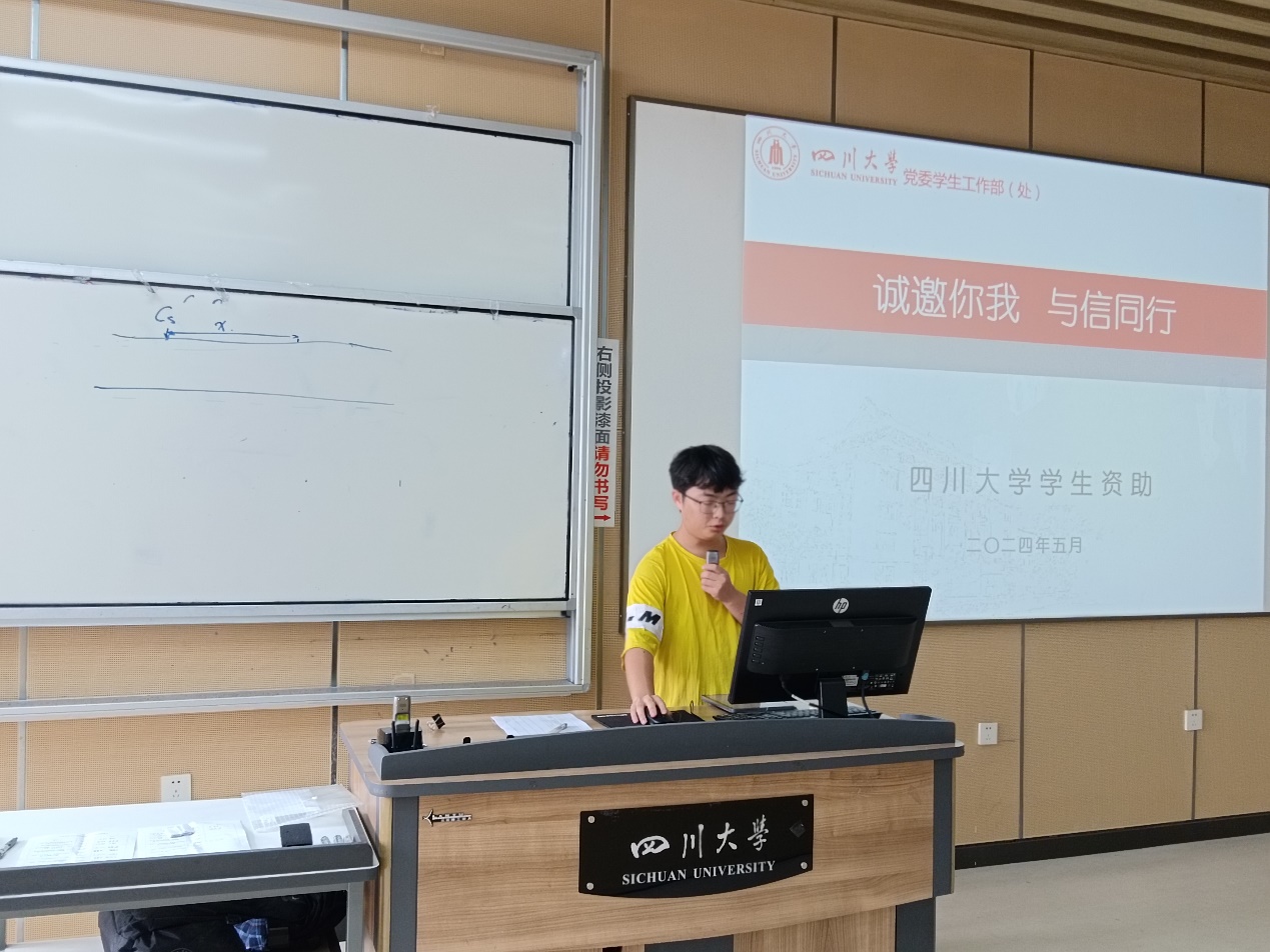 为了让学校的资助政策更多惠及有困难的学生,同时加强受助学生的诚信教育,落实学校的资助育人工作。2024年5月24日,77779193永利官网2023级本科生年级顺利举办“诚信伴我行”资助宣讲活动。77779193永利官网2023级辅导员浩涛涛老师,本年级阳光资助宣传员以及77779193永利官网2023级全体同学参与了此次宣讲活动。