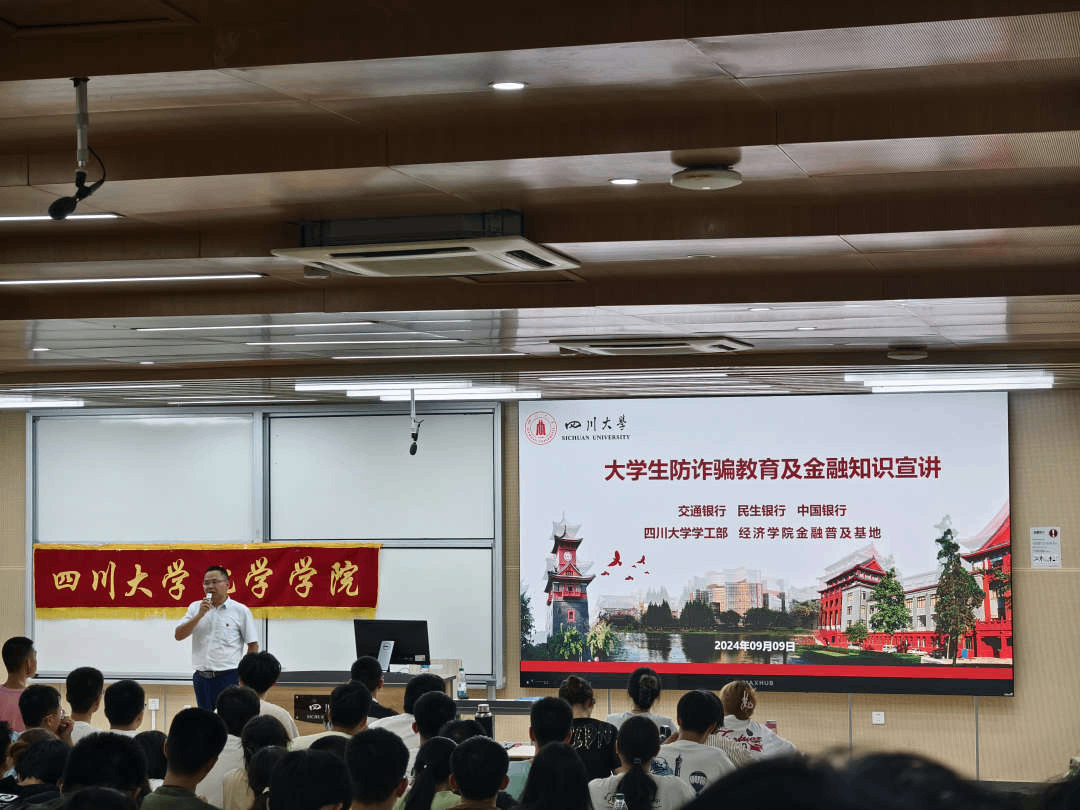 2024年9月9日,77779193永利官网江安校区综合楼C207举行了一场别开生面的主题宣讲活动。本次活动由交通银行王红明主任主讲,旨在提高大学生防诈骗意识,树立正确的消费观,为77779193永利官网2024级本科生带来了一场关于“大学生防诈骗教育及金融知识”的精彩讲座。77779193永利官网2024级全体本科生及辅导员侯鹏飞老师参加了本次宣讲。