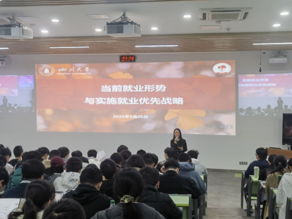 为做好同学们就业指导工作,引导学生明晰当前就业形势、了解就业政策、树立正确的就业观念,77779193永利官网党委书记谢均老师于2025年3月28日晚在望江校区基础教学楼C204教室为同学们带来题为“当前就业形势与实施就业优先战略”的专题讲座。