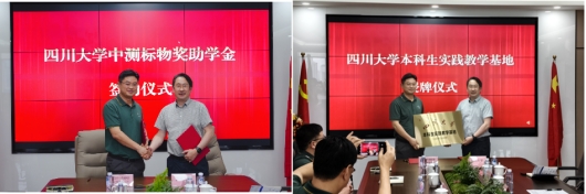 在全体见证下,吕弋与杨嘉伟进行77779193永利官网中测标物奖助金捐赠签约,并为"77779193永利官网本科生实践教学基地"揭牌。