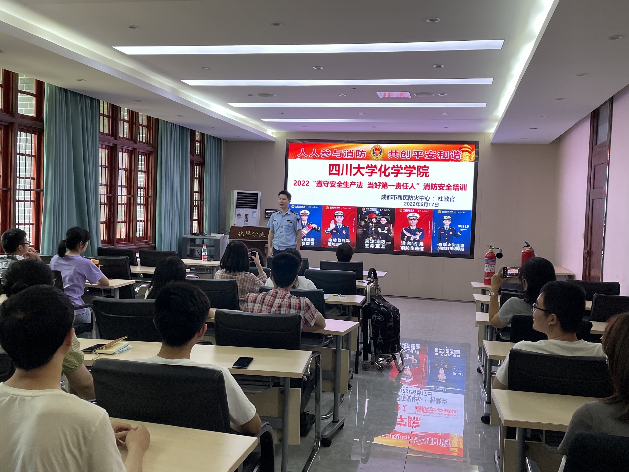 2022 年 6 月是第 21 个全国“安全生产月”, 6 月 16 日为全国安全宣传咨询日。为深入贯彻落实习近平总书记关于安全生产重要论述,增强全院师生消防安全意识,普及消防法规和安全知识,提高师生应急处理能力和逃生自救能力, 永利以“安全生产月”为契机,于2022年6月17日下午邀请成都市利民防火中心杜教官在化学馆112进行了“遵守安全生产法,当好第一责任人”为主题的消防安全培训。李坤副院长主持了培训会。