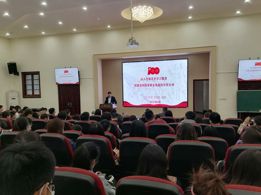 宣讲会上,纪志耿教授以“深入开展党史学习教育,把握党和国家的历史发展主动”为题,从“充分认识开展党史学习教育的重大意义”、“全面了解中国共产党百年奋斗的光辉历程和历史性贡献”、“深刻把握开展党史学习教育的重点”和“学懂弄通做实习近平新时代中国特色社会主义思想”等四个方面,结合四川省和川大悠久的红色历史和光荣的革命传统,对开展党史学习教育的意义、重点和着力点进行了全面系统的宣讲。报告深入浅出,以丰富的例子为大家介绍了党史学习教育的意义和学习重点,赢得了与会同志们的热烈掌声。