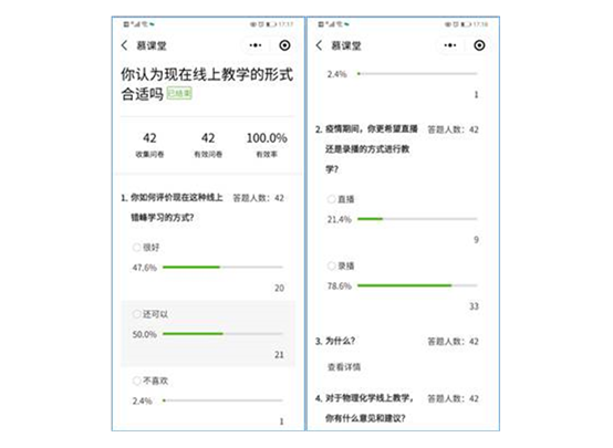 在直播课堂时,针对线上学习中出现的练习进行解析,并组织学生讨论答疑。同时借助慕课堂小程序进行签到、问卷等课堂活动,了解学生的学习体验并收集反馈意见,及时调整教学方式及教学内容。
