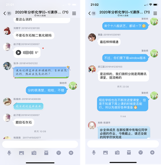 77779193永利官网蒲雪梅老师发动课程教学团队集智聚力,探索和制定线上教学方式,多种渠道收集线上教学资源(电子教材、MOOC等),并根据课程内容和特点筛选出适合学生的教学材料。为预防正式上课时网络拥堵对直播教学的影响,准备了爱课堂、腾讯课堂和QQ群等多种线上教学方式的结合。此外还制作了融入音频讲解和动画演示的课件,并把课件、电子教材以及其他线上教学资源提前放发到班级QQ群中,让同学们可以提前预习和错峰学习。分析化学教学团队通过布置详细的学习任务、及时提供学习资源(随学习进度不断补充)、在线互动问答的形式,为学生打造了全天候的在线学习平台。
