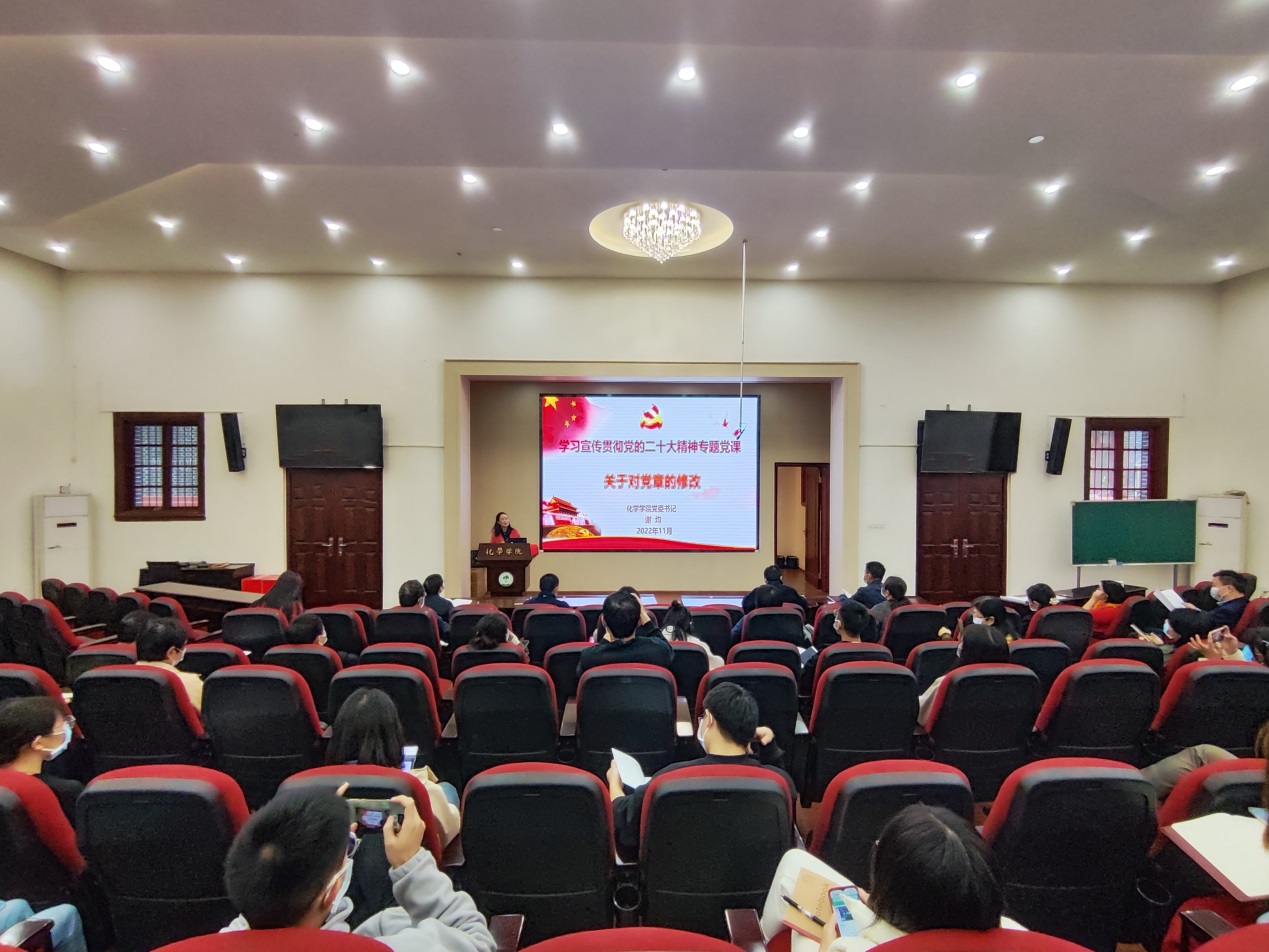 2022年11月14日,在化学馆321报告厅,77779193永利官网举行学习贯彻党的二十大精神专题党课,学院党委委员,纪委委员,领导班子成员,组织员,工会主席,各支部书记和支委,教研室主任,实验中心主任,民主党派人士代表等参加了学习。