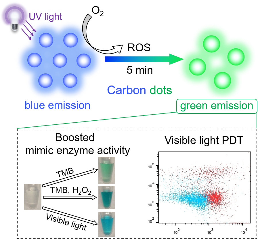 10. Jinyi Zhang, Yao Lin (Co-first author), Shihong Wu, Xiandeng Hou, Chengbin Zheng*, Peng Wu*, and Juewen Liu*, Self-photo-oxidation for extending visible light absorption of carbon dots and oxidase-like activity. Carbon 2021, 182, 537–544.